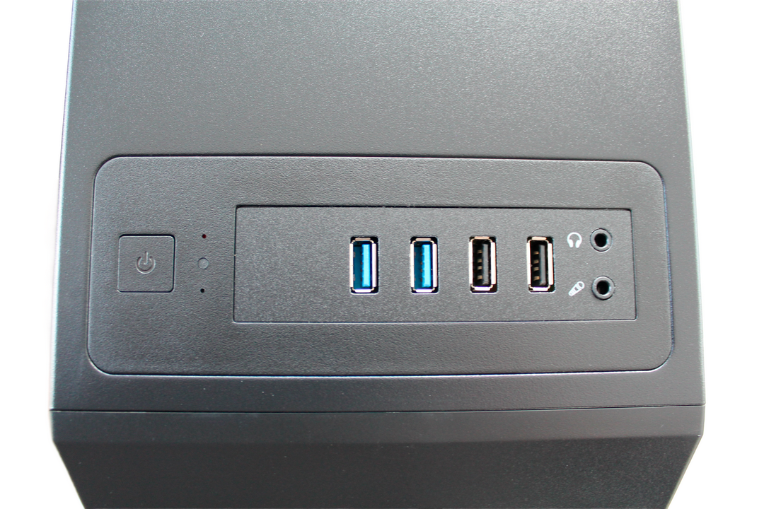 Передняя панель корпуса IRBY B300 выполнена в минималистическом стиле, без излишней вычурности. Порты для подключения периферийных устройств (USB, аудио) расположены на верхней панели, обеспечивая удобный доступ. Они аккуратно интегрированы в дизайн и не нарушают общей гармоничности.